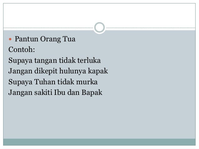 Ingin sekali segera bergaya. Di sawah ada banyak jangkrik ada juga katak dan serangga raihlah pendidikan yang baik selagi masih berusia muda. Karena ungkapan perasaan dan pikiran tersebut disusun dengan kata kata yg sedemikian rupa sehingga menarik untk didengar atau dibaca. Contoh beberapa pantun yang bersisi nasihat dari orang tua adalah sebagai berikut.