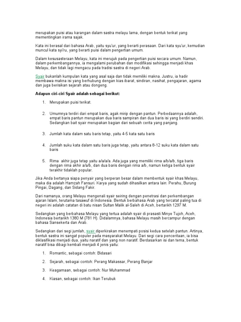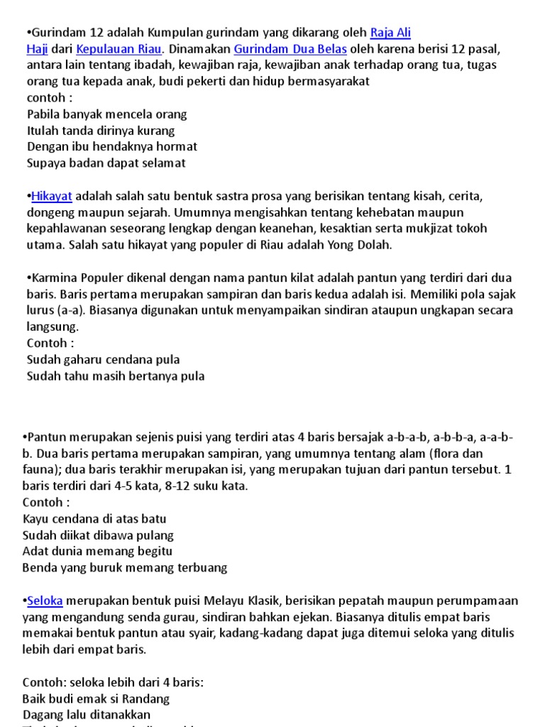 Pantun biasanya terdiri atas empat larik atau empat baris yang terdiri dari sampiran da nisi dan bersajak ab ab. Dua baris pertama berisi sampiran dan dua baris terakhir adalah isi. Apa gunanya berkain batik kalua tidak dengan sujinya apa gunanya beristri cantik kalua tidak dengan budunya telaah a. Sampiran adalah dua baris pertama kerap kali berkaitan dengan alam mencirikan budaya agraris masyarakat pendukungnya dan biasanya tak punya hubungan dengan bagian kedua yang menyampaikan maksud selain untuk mengantarkan rima sajak dua baris terakhir merupakan isi yang merupakan tujuan dari pantun tersebut.