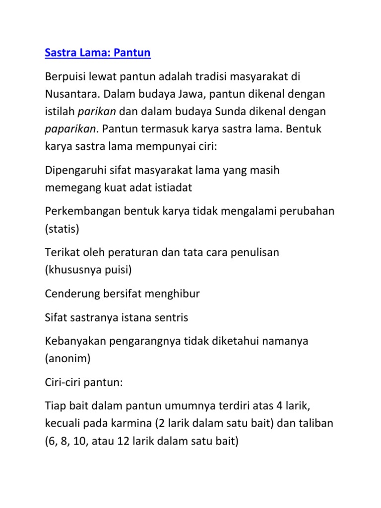 Pantun adalah karya sastra lama yang terikat oleh. Macam puisi pun sangat beragam. Khususnya karya sastra indonesia. Apa yang dimaksud karya sastra. Kata pantun berasal dari bahasa jawa kuno yaitu tuntun yang artinya menyusun atau mengatur.