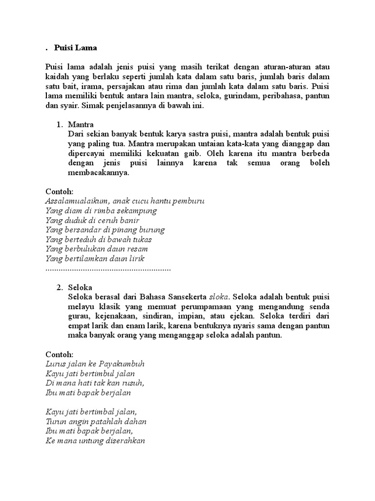 Pantun salah satu jenis karya sastra yang lama. Setiap baris terdiri dari 8 12 suku kata 6. Pantun adalah puisi indonesia melayu tiap bait kuplet biasa terdiri atas empat baris yang bersajak a b a b tiap larik biasanya berjumlah empat kata. Pantun adalah puisi melayu asli yang sudah mengakar lama di budaya masyarakat.