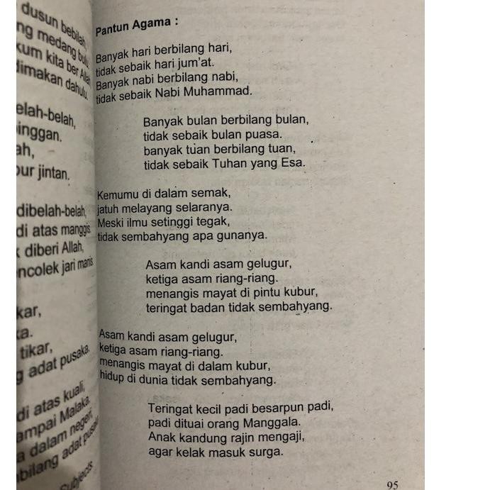 Tentu saja isi pantunnya berisi pokok pokok ajaran agama yang dirangkai sedemikian rupa hingga berbentuk pantun. Banyaklah bulan antara bulan tidak semulia bulan puasa. Islam untuk beribadah sesuai dengan aturan dalam agamanya. Asam kandis asam gelugur ketiga asam riang riang menangis di pintu kubur teringat badan tidak sembahyang.