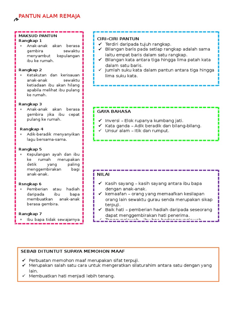 Terkadang muncul beberapa pertanyaan di soal sekolah mengenai sebutkan ciri ciri pantun maka kita perlu tahu mengenai ciri ciri pantun. Setiap rangkap pantun terbahagi kepada dua bahagian iaitu bahagian pembayang dan satu lagi bahagian maksud. Dari segi usia pantun terdiri dari pantun kanak kanak pantun muda dan tua. Pada dasarnya kata pantun tersebut berasal dari bahasa jawa kuno yakni tuntun yang berarti ialah mengatur atau menyusun.
