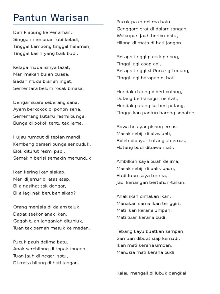 Pantun anak itik anak ayam. Di bawah ini terdapat 5 bahagian pantun lawak iaitu pantun lawak pantun hari lawak isnin hingga ahad pantun lawak malam pantun lawak serius dan pantun lawak lain dari yang lain. Pantun anak anak tidak hanya orang dewasa anak anak kerap kali mengekspresikan apa yang dirasakan entah itu bahagia atau sedih dengan banyak cara. Uatu masa dahulu pantun dan nyanyian lagu kanak kanak merupakan salah satu kaedah yang digunakan masyarakat khususnya bagi masyarakat melayu di malaysia dalam mendidik anak anak. Pantun yok makan bubur ayam di maladewa minum kopi di hungaria selamat hari senin sahabat hawa jangan lupa bersyukur dan bahagia anak itik main di rawa rawa burung beo makan pepaya hei sahabat hawa.