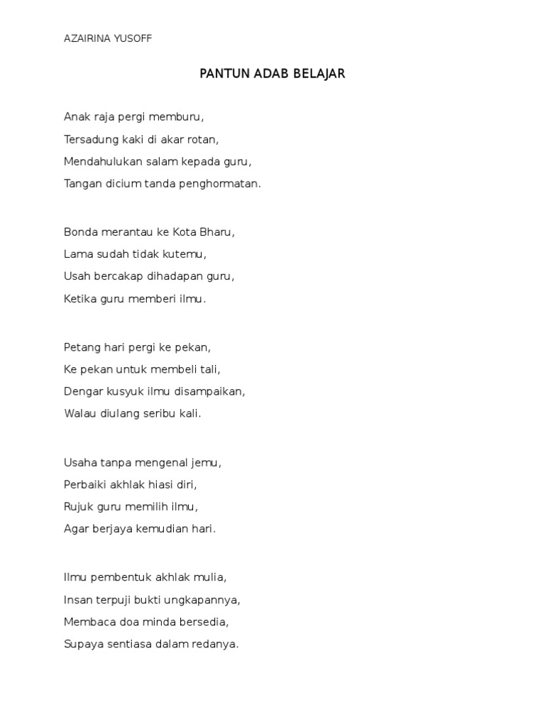Pantun anak tentang belajar. Pantun bertujuan untuk menyampaikan pesan pesan tertentu pada pembacanya. Berikut ini beberapa contoh nasehat yang terkandung dalam pantun motivasi belajar tentang anjuran belajar untuk menyongsong masa depan yang lebih baik. Mari belajar berpuasa di bulan ramadhan banyak pahala. Contoh pantun anak rajin belajar.