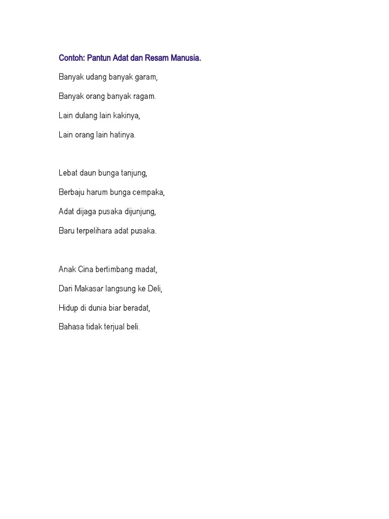 Anak udang mati dituba dalam kitab ada terlarang yang haram jangan dicoba bunga kenanga di atas kubur pucuk sari pandan jawa. Pada saat ini ditemukan banyak pantun anak anak yang menggambarkan perasaan anak anak dengan bahasa yang sederhana.