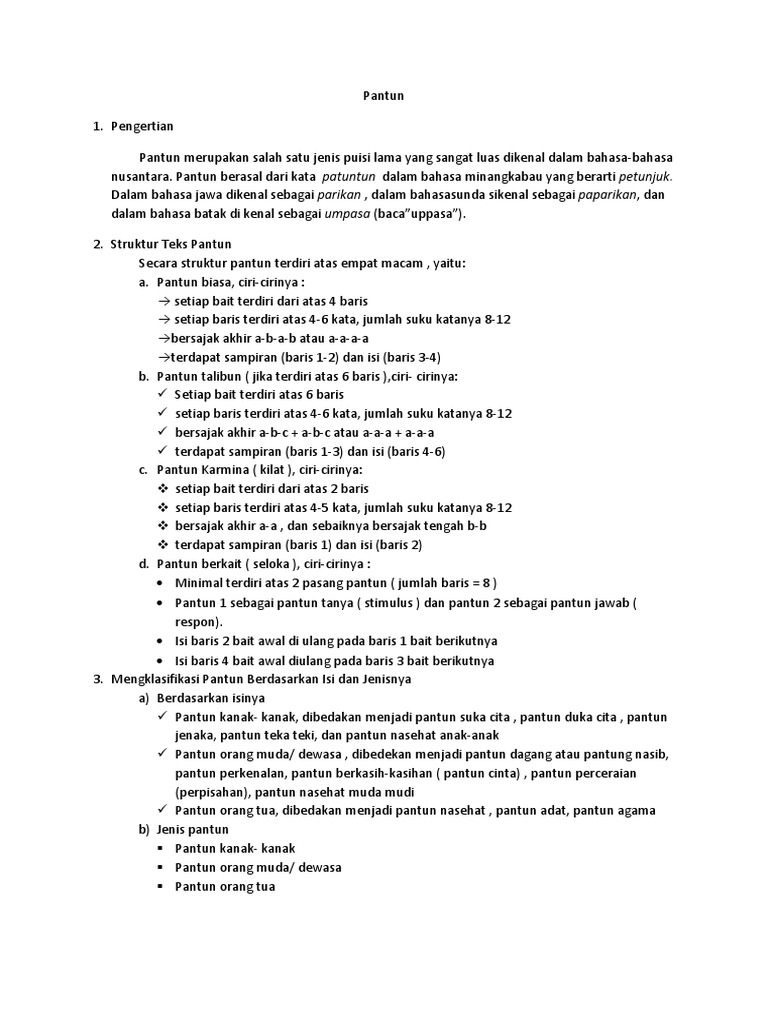 Pantun adalah pengertian ciri syarat struktur kaidah jenis contoh untuk pembahasan kali ini kami akan mengulas mengenai pantun yang dimana dalam hal ini meliputi pengertian ciri struktur kaidah jenis dan contoh nah agar lebih dapat memahami dan mengerti simak ulasan selengkapnya dibawah ini. Pantun memiliki nama lain dalam bahasa bahasa daerah dalam bahasa jawa pantun dikenal dengan parikan dalam bahasa sunda pantun disebut paparikan dan dalam bahasa batak pantun dikenal dengan sebutan umpasa. Pantun adalah salah satu jenis puisi lama yang sangat dikenal oleh masyarakat melayu. Pantun diambil dari kata patuntun yang dalam bahasa minangkabau berarti pentuntun.