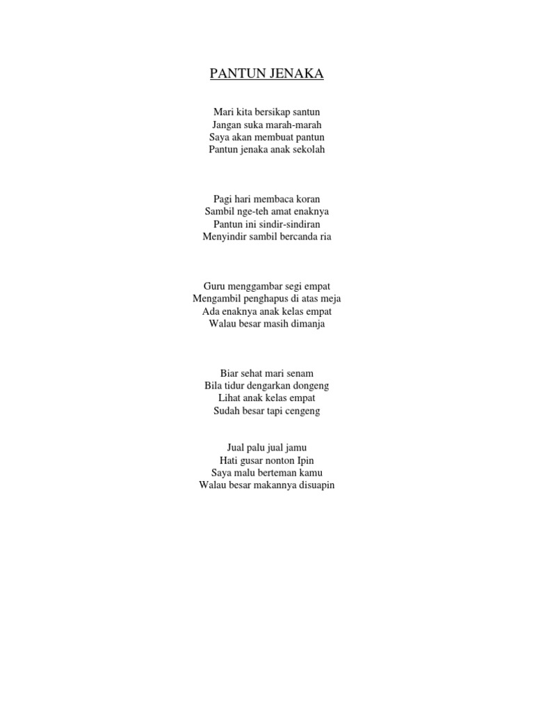 Hidup sehat merupakan dambaan setiap manusia. Sarapan pagi memakan bakwan bakwan dimakan bersama pecal senang hati bisa berkawan. Dapat disimpulkan bahwa kata pantun mempunyai makna yang mengatur setiap pembacanya untuk memahami nasehat dan makna yang terdapat dalam kandungan isi pantun tersebut. Pantun jenaka adalah salah satu jenis pantun dalam sastra indonesia yang mengandung unsur humor atau lucu.