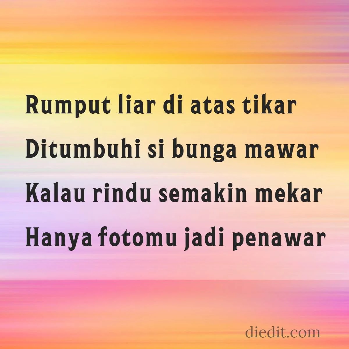 Pantun cinta maut. Bambu cina dibuat rakit bambunya kupotong panjangnya sama. Sungguh tak kuduga hatiku sakit karena cinta suciku tak jua kau terima. Tahu dari manakah datangnya. Kalau rindu padamu dinda ingin bertemu tetapi pada sesiapa rindu ini dikirimnya.
