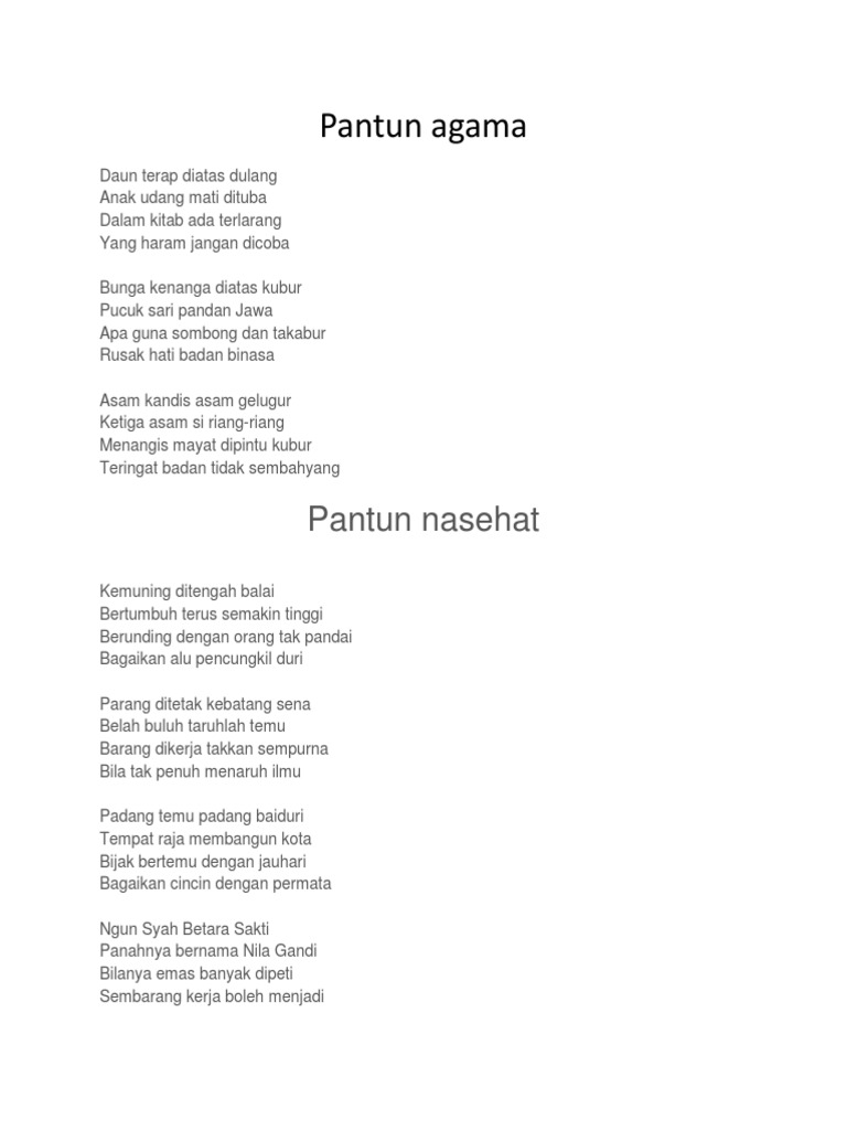 Sehingga sebuah puisi tidak dapat disebut pantun ketika tidak memenuhi ketentuannya. Dimana kuang hendak bertelur di atas lata dirongga batu dimana tuan hendak tidur di atas dada dironggah susu. Di dalam bahasa jawa contohnya kita mengenal sebagai parikan dalam bahasa sunda biasa di kenal dengan paparikan sedangkan di dalam bahasa batak biasa di sebut sebagai umpasa. Pantun di atas termasuk jenis pantun nasihat.