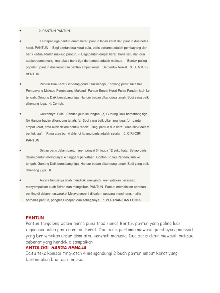 Pantun ialah suatu bentuk puisi indonesia melayu tiap bait kuplet terdiri dari sebuah empat baris yang bersanjak a b a b pada tiap larik biasanya terdiri atas sebuah empat kata baris pertama dan baris kedua biasanya untuk suatu tumpuan sampiran saja sedangkan pada beris ketiga dan keempat ialah isi. Masih banyak karya sastra puisi lain seperti mamang yang merupakan. Pantun yang sempurna dan popular ialah pantun empat baris sebagaimana yang tersisip dalam teks melayu lama terutama karya historiografi yang merupkan gabungan sastera rakyat dengan sastera istana. Seloka adalah pantun yang terdiri dari empat baris yang terdiri dari beberapa untai.
