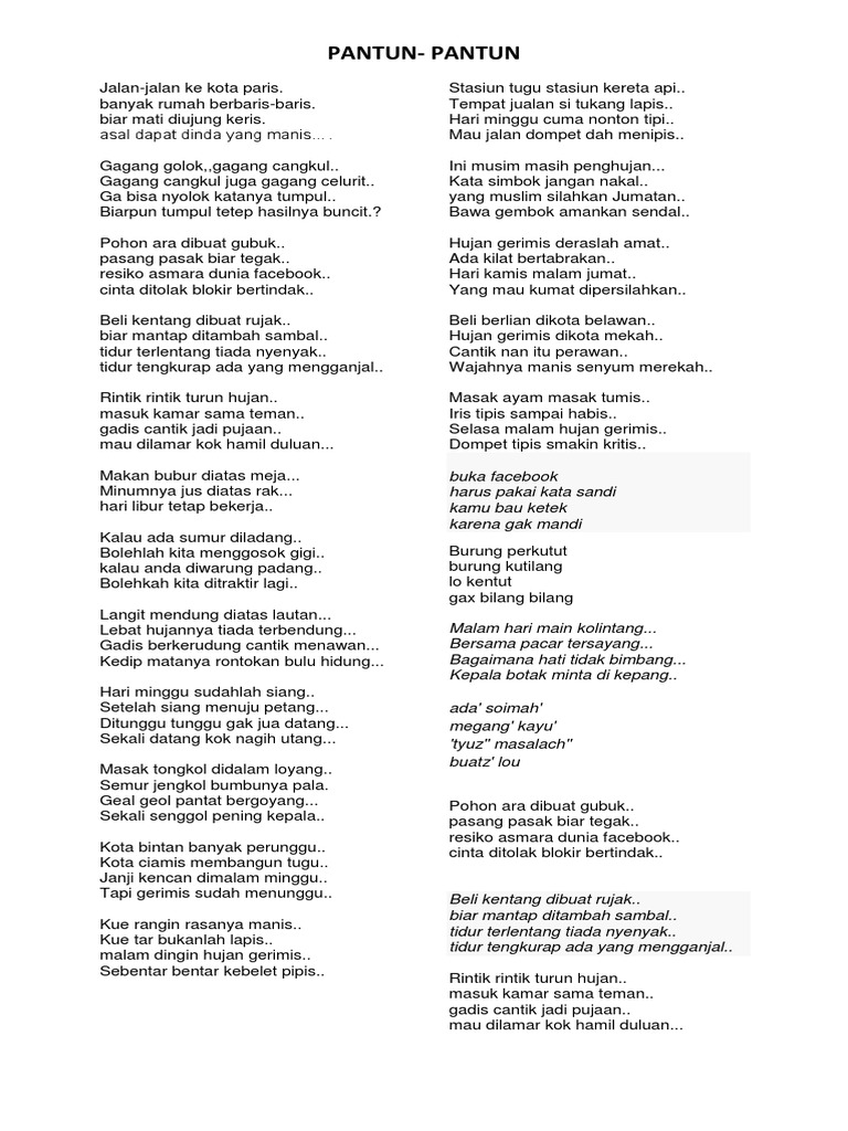 Kalau sarapannya bubur enak nih. Lalu hindari jajan sembarangan yang tidak jelas kandungannya agar dirimu tetap sehat. Sebagai karya seni pembuatan pantun ini tentunya harus memiliki konotasi kata yang enak didengar dan tentunya dapat mengundang tawa bagi yang mendengarnya. Pantun ini dapat dipersembahan saat pemberian bunga rampai pada perkawinan adat melayu.
