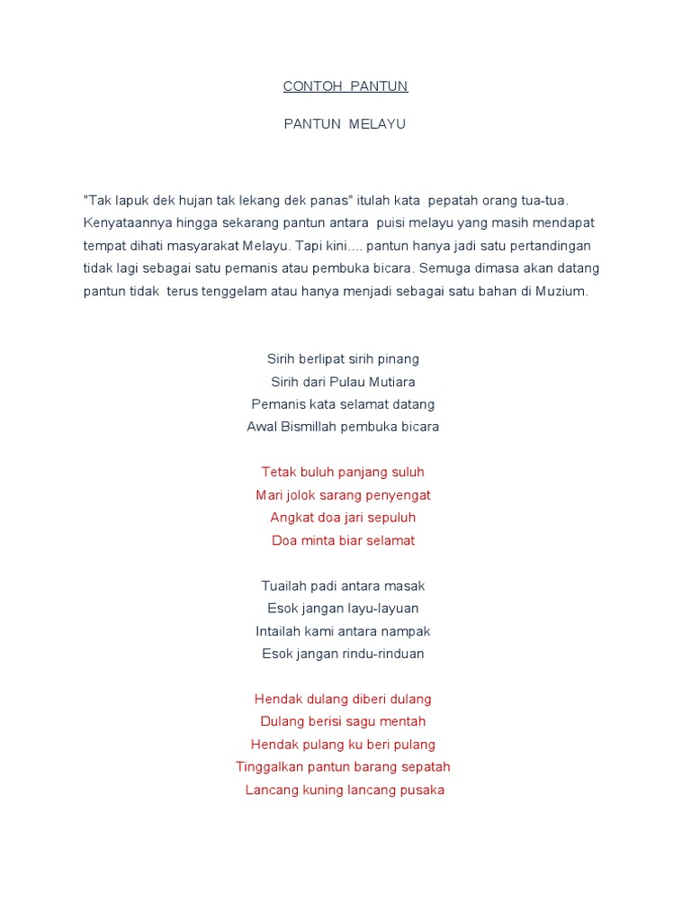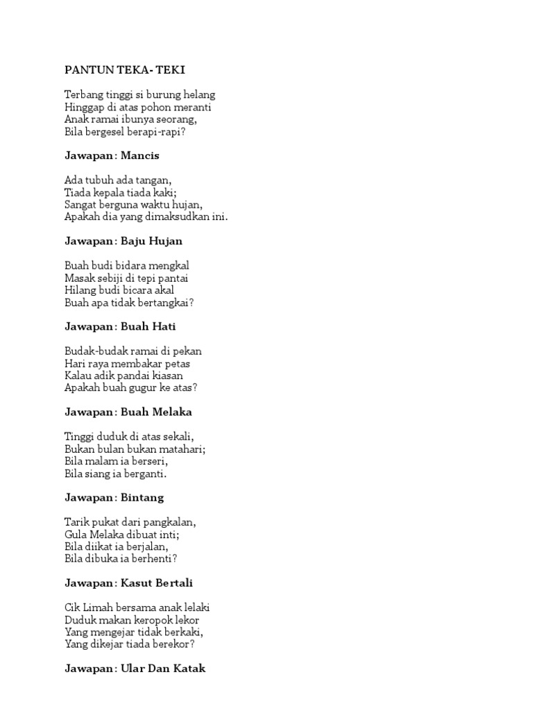 Memberikan kesejukan dan membersihkan. Budi pekerti bukan dilakon. Di zaman dahulu pantun diungkapkan dengan lisan terutama oleh masyarakat melayu di indonesia namun seiring berjalannya waktu pantun juga diungkapkan melalui tulisan seperti di buku maupun surat kabar. Pantun teka teki adalah salah satu jenis pantun permainan yang bersifat jenaka.