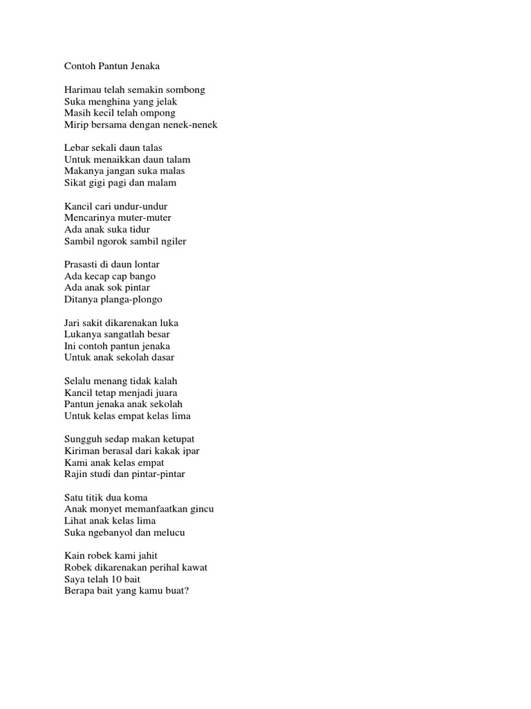 Selain sampiran dan isi pantun juga memiliki ciri khas lain berupa penggunaan pola perulangan bunyi atau rima pada setiap baitnya yang. Ada sekitar 100 lebih contoh pantun jenaka yang bisa kamu temui dibawah ini berikut ulasannya. Pantun jenaka pantun ini mungkin sudah tidak asing lagi ditelinga kita apalagi kalo kamu masih duduk dibangku sekolah pantun jenaka sangat populer dibandingkan pantun lain untuk anak sd smp sma smk bahkan perguruan tinggi khususnya biasanya kalian disuruh membuat pantun jenis ini karena pantun ini dapat dijadikan sebagai permainan lucu lucuan becandaan bersama teman ataupun sahabat. 7 contoh pantun jenaka dan maknanya akan dibahas secara lengkap pada materi pelajaran bahasa indonesia sebagai berikut ini.
