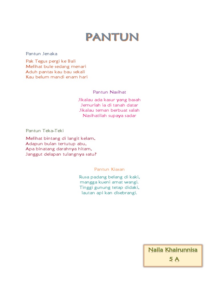 Pengertian pantun adalah salah satu jenis puisi. Contoh pantun pantun adalah salah satu jenis puisi lama yang terdiri dari empat larik berirama bersilang sajak a b a b dan mempunyai makna yang penting baik untuk nasehat maupun yang lainnya. Contoh pantun pantun adalah sebuah jenis puisi lama yang terdiri dari empat baris dimana baris pertama dan kedua adalah sampiran sedangkan baris ketiga dan keempat adalah isi. Pantun kiasan adalah pantun yang berisi perumpamaan atau ibarat biasa digunakan untuk menyampaikan suatu hal secara tersirat.