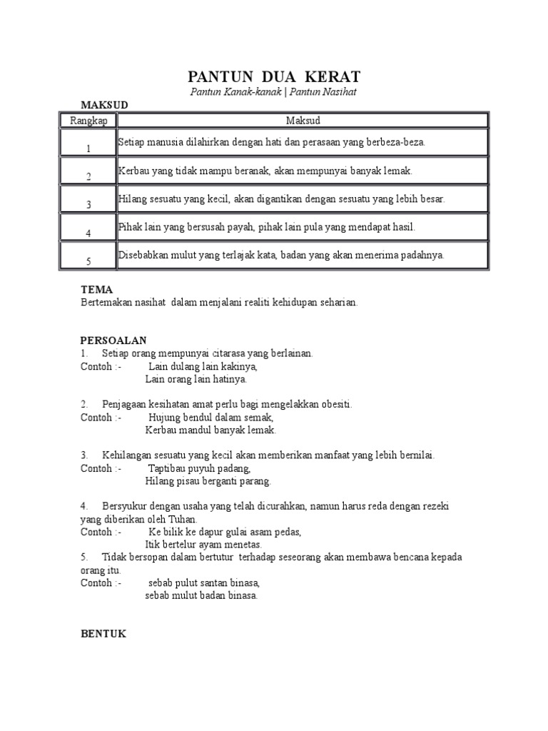 Karena ungkapan perasaan dan pikiran tersebut disusun dengan kata kata yg sedemikian rupa sehingga menarik untk didengar atau dibaca. Didalam bahasa tagalog tonton bermakna bercakap sesuai dengan aturan tertentu dalam bahasa jawa kuno tuntun yang artinya benang dan atuntun yang berarti teratur serta matuntun. Zaman dahulu pantun menduduki tempat yang penting dalam kehidupan masyarakat khususnya masyarakat melayu pantun banyak digunakan dalam permainan kanak kanak dalam percintaan upacara peminangan dan pernikahan nyanyian dan upacara adat secara umum setiap tahap kehidupan masyarakat melayu dihiasi oleh pantun. Jalan jalan ke kota tua tidak lupa membeli gabah hati ini begitu gembira mendapat nilai bagus di sekolah.