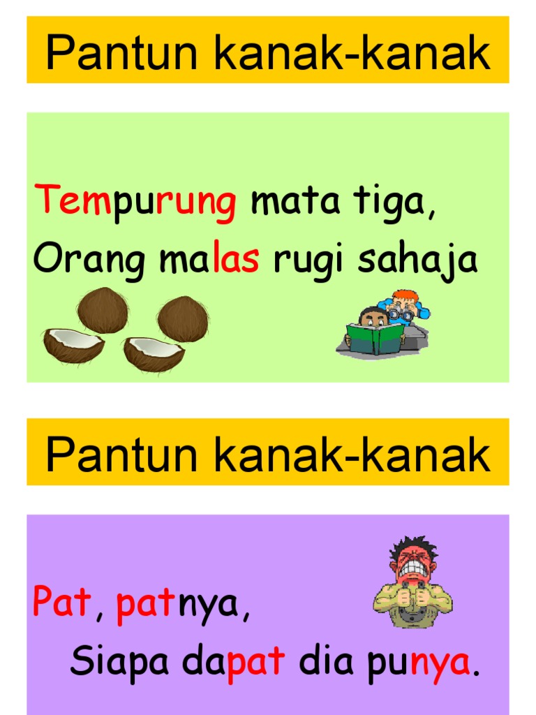 Perlu bakat dan kemampuan yang diasah. Contoh pantun kanak kanak terbang rendah burung kutilang hinggap di dahan sambil menoleh hatiku senang tidak kepalang ayah pulang membawa oleh oleh sapi putih tarik pedati pedatinya bergoyang goyang ayah selalu baik hati aku ditimang aku disayang. Pantun anak merupakan suatu pantun yang isinya menggambarkan dunia atau kehidupan anak anak seperti menggambarkan kegembiraan kesenangan belajar bermain dan lainnya. Dengan pantun semua pesan nasehat atau bahkan guyonan kata orang sekarang punchline menjadi.