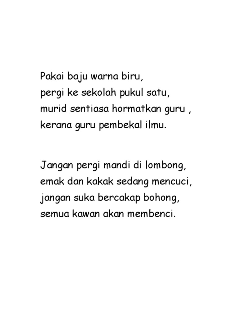 Pantun kanak kanak sekolah. Dari segi usia terdiri dari pantun kanak kanak pantun muda dan juga pantun tua. Para guru biasanya memberi tugas kepada siswa sd untuk membuat berbagai macam pantun seperti pantun anak sekolah pantun nasehat anak pantun jenaka anak pantun teka teki anak dan lain lain. Contoh pantun kanak kanak muda dan tua pantun adalah bentuk puisi indonesia melayu yang merupakan ungkapan perasaan dan pikiran yang dapat menghibur sekaligus menegur. Pantun anak pada masa sekolah tentu tidak asing dengan pantun ini.