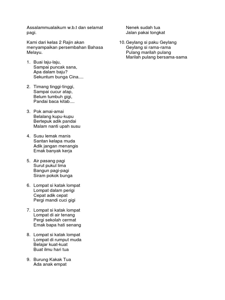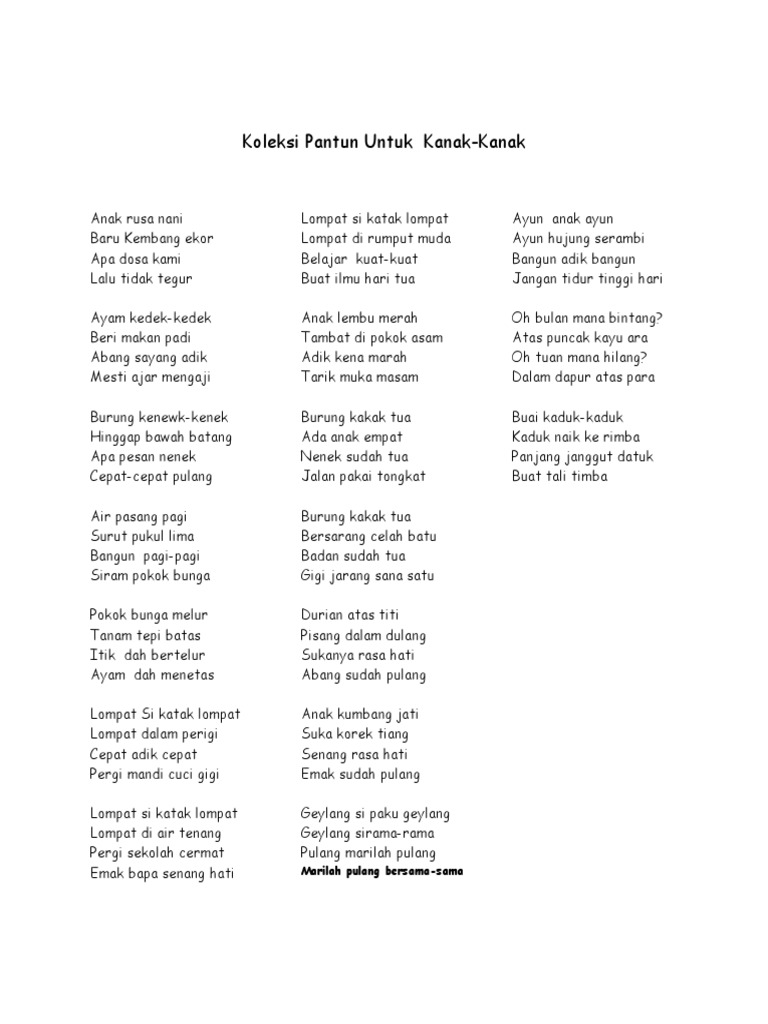 Pantun kanak kanak tentang burung. Macam macam pantun antara lain adalah pantun nasehat pantun agama pantun teka teki pantun cinta pantun anak anak lucu atau pantun jenaka dan lain sebagainya. Karena ungkapan perasaan dan pikiran tersebut disusun dengan kata kata yg sedemikian rupa sehingga menarik untk didengar atau dibaca. Contoh pantun kanak kanak muda dan tua pantun adalah bentuk puisi indonesia melayu yang merupakan ungkapan perasaan dan pikiran yang dapat menghibur sekaligus menegur. Ada pantun kanak kanak pantun muda dan pantun tua.