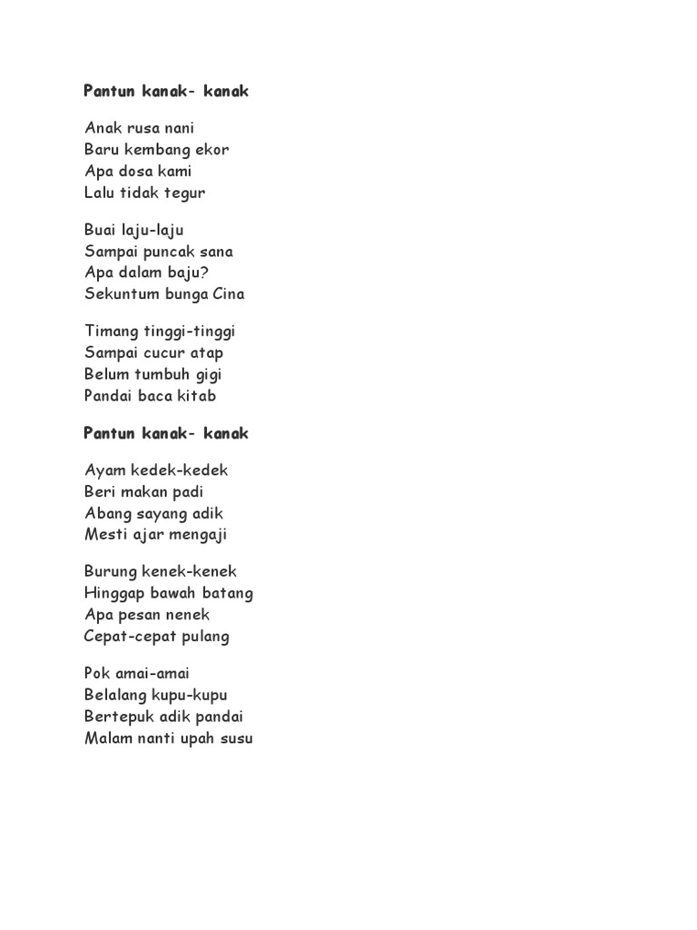 Pantun kanak kanak pantun merupakan jenis puisi lama yang dibentuk dengan berbagai diksi pilihan yang sesuai dan serasi. Oleh karenanya pantun kerap memiliki hikmah hikmah agar pendengarnya menjadi semakin baik di masa mendatang. Telah lama tidak bersua. Hati sedih karena rindu.