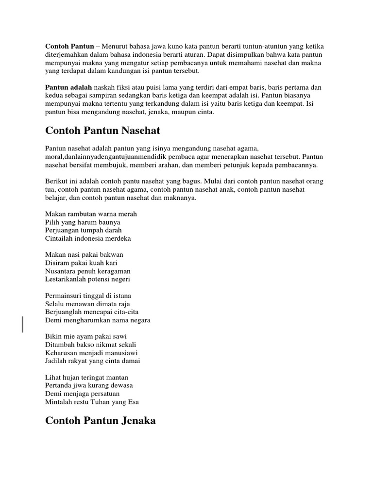 Pantun keberagaman agama. Tak hanya itu pantun lucu juga bisa menjadi solusi buat orang terdekat yang hatinya sedang galau atau sedih. Namun topik topik dalam pantun agama lebih spesifik karena mengandung nilai nilai dan prinsip prinsip agama tertentu. Berikut ini contoh contoh pantun nasehat motivasi diri agar selalu melaksanakan sholat. Pantun kesatuan dan persatuan bangsa indonesia harus dikenalkan dan diamalkan sejak dini karena memiliki kesadaran akan persatuan itu sangat penting sekali dengan melihat sejarah bahwa bangsa ini dibangun atas keragaman yang begitu mengagumkan sudah seharusnya persatuan itu dilestarikan atau dibiasakan sejak dini.