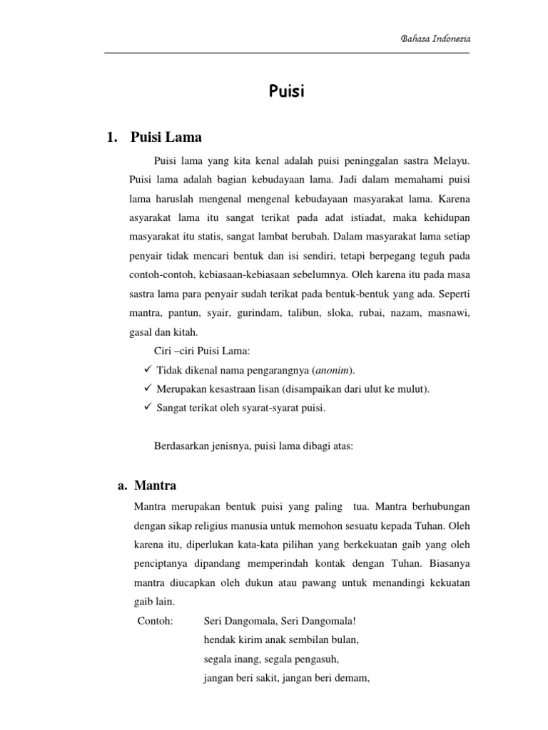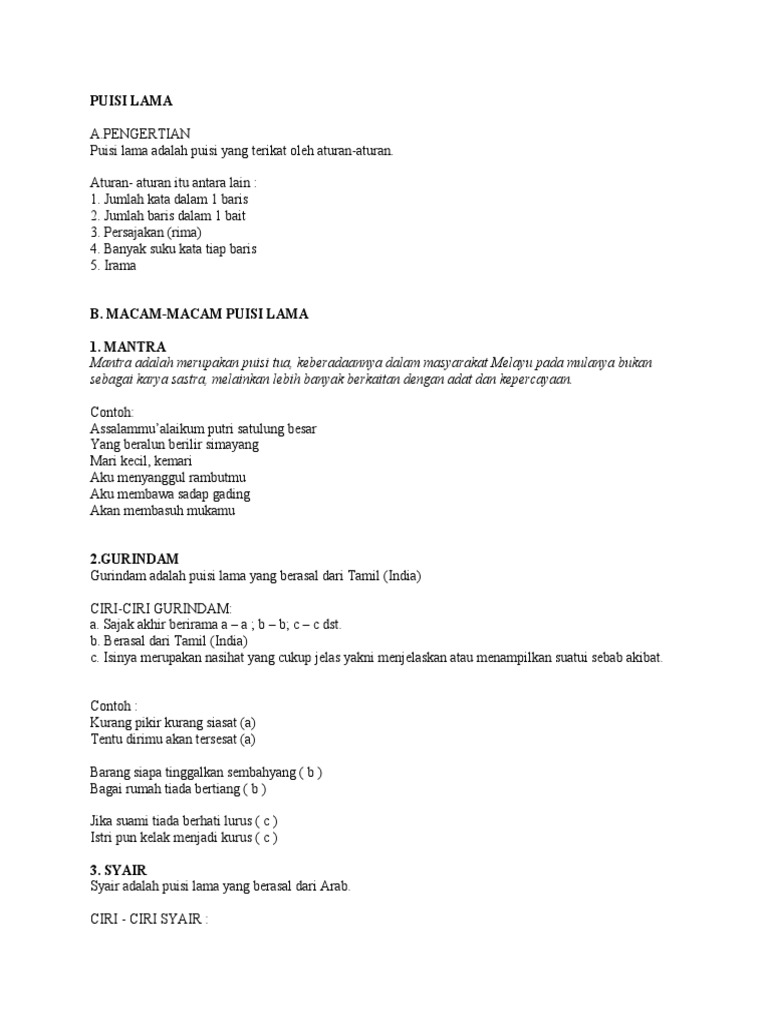 Jenis puisi yang merupakan warisan leluhur ini dibagi menjadi 7 jenis yaitu. Dalam bahasa jawa misalnya dikenal sebagai parikan dalam bahasa sunda dikenal sebagai paparikan dan dalam bahasa batak dikenal sebagai umpasa baca. Syair adalah salah satu jenis jenis puisi lama yang terdiri dari 4 baris dengan sajak a a a a. Seloka merupakan jenis puisi lama yang berasal dari daerah melayu.