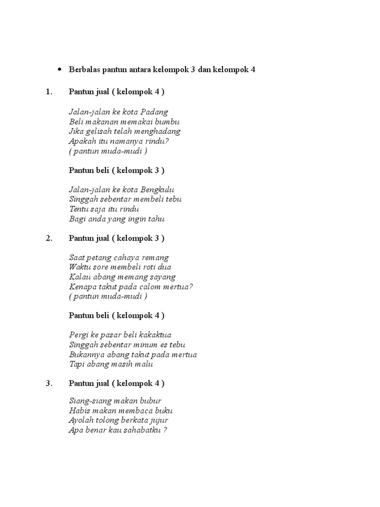 Apin membakar ujung cerutu membawa asap bersesak sesak. Kumpulan pantun muda mudi terbaru berbalas pantun april 23rd 2018 kreasi remaja yang dapat kita nikmati salah satunya adalah pantun muda mudi berbalas pantun pada update kali ini kami akan berbagi sebuah kumpulan pantun pergaulan muda mudi yang merupakan koleksi terbaru yang biasa digunakan pada acara berbalas pantun. Pantun berbalas sangat berguna untuk memberikan hiburan dari berbagai karya sastra yang bersasal dari indonesia yang biasanya diikuti oleh 3 orang atau lebih. Baik pula budi pekertinya.