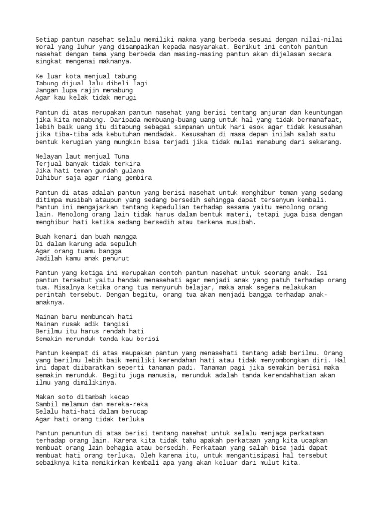 Pantun tersebut adalah pantun yang memberikan nasehat kepada kita untuk selalu menabung agar bisa mendapatkan keuntungan di kemudian hari. Pantun akan jauh lebih efektif digunakan dibandingkan dengan sekedar kata kata biasa karena di dalam pantun biasa terdapat bahasa kiasan yang mengandung arti mendalam. Contoh pantun nasehat terbaik dan terbaru 2020 pantun merupakan salah satu bentuk puisi lama yang berasal dari kata tuntun dari bahasa jawa yang artinya menyusun menuntun atau mengatur. Nah itu perlu anda ketahui dalam kehidupan.