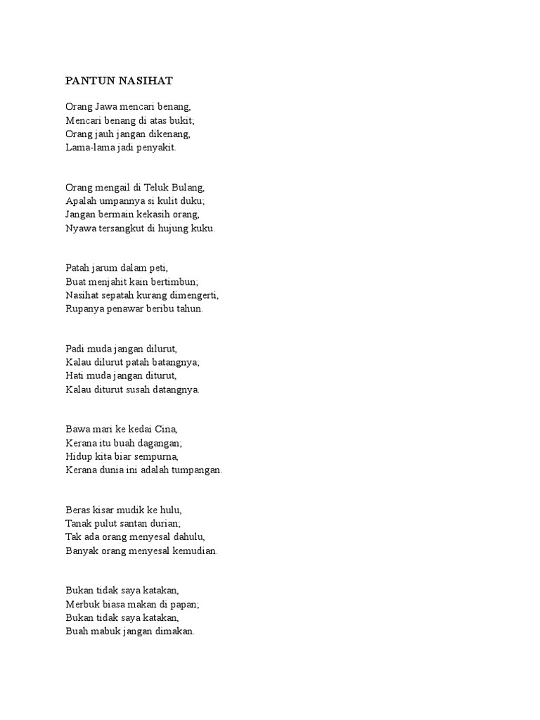 Sekolah merupakan lokasi atau tempat pertama yang kita jejaki selain rumah. Agama islam yaitu agama yang selamat dengan mengerjakan segala perintah dan menjauhi segala larangan yang telah di tentukan oleh allah swt. Isi atau makna pantun bisa mengandung unsur nasehat jenaka nasihat cinta atau lainnya. Pantun adalah contoh nasihat yang dapat diterima oleh anak dengan baik tanpa sifat menggurui.