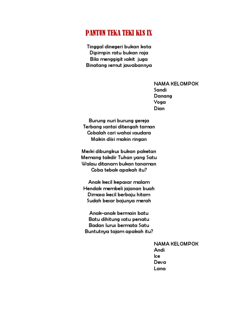 Pantun teka teki anak sd. Pantun teka teki bisa digolongkan ke dalam permainan dalam sebuah karya sastra. Dengan pantun bermain teka teki bisa sambil melucu dan tentu akan lebih seru. Keenam yaitu pantun teka teki. Pantun teka teki sebagian dari kita pasti sudah tidak asing lagi dengan yang namanya pantun.