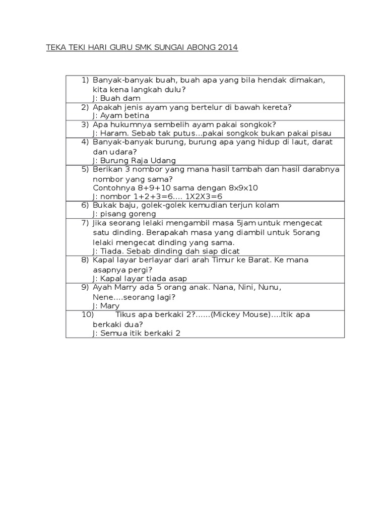 Pantun jenis ini terbilang sangat menarik karena berisikan pertanyaan yang biasanya disisipkan pada bagian akhir pantun. Ciri ciri pantun ini yakni terdapatnya pertanyaan yang menarik untuk dijawab. Karena teka teki pada hakikatnya soal yang berupa. Untuk peringatan post di atas iaitu contoh teka teki hari raya yang berguna untuk para guru di tulis oleh admin pada 2018 08 09 13 48 40.
