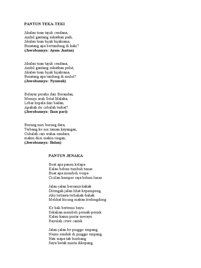 Ada banyak macam macam pantun seperti pantun anak anak pantun agama pantun nasehat pantun. Pantun jenis ini terbilang sangat menarik karena diakhir pantunnya disisipkan sebuah pertanyaan dan disitu kita diharus untuk bisa menjawab pertanyaan tersebut. Salam sayang dari pihak editor. Ciri ciri pantun ini yakni terdapatnya pertanyaan yang menarik untuk dijawab.