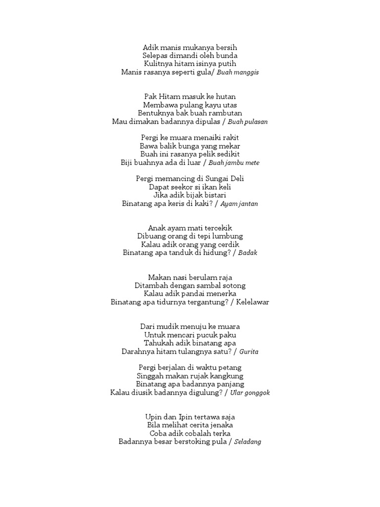 Pantun teka teki yang ada di upin ipin. Mulai coba gratis batalkan kapan saja. Ciri ciri utama dari pantun ini adalah terdapat pertanyaan yang akan sangat seru dan menarik untuk dijawab sehingga dapat membuat penasaran yang mendengarkan pantun teka teki ini. Tak sebatas itu ia pun dikenal karena kepandaiannya berpantun. Budak jalan terjengket jengket berjalan hingga ke kuala lumpur warna putih berderet deret pagar di dalam dinding di luar.