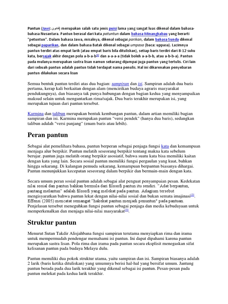 Pantun terdiri atas dua bagian yaitu. Bagian bagian pantun pantun memiliki dua pokok struktur utama yaitu sampiran dan isi. Terdapat 8 12 suku kata dalam satu bait. Lazimnya pantun terdiri atas empat larik atau empat baris bila dituliskan tiap larik terdiri atas 8 12 suku kata bersajak akhir dengan pola a b a b ataupun a a a a tidak boleh a a b b atau a b b a. Pantun kilat sering disebut juga karmina ialah pantun yang terdiri atas dua baris baris pertama merupakan sampiran sedang baris kedua merupakan isi.