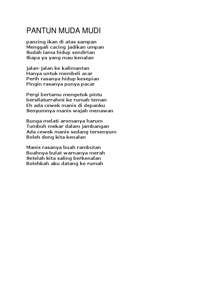 Pantun untuk muda mudi. Tujuan penelitian ini adalah untuk menganalisis dan mendeskripsikan bentuk dan makna pantun muda mudi daerah daya dialek gedung wani kecamatan runjung agung oku selatan selanjutnya manfaat penelitian inibagi masyarakat diharapkan dapat. Pantun yang berkaitan dengan dunia anak muda seperti cinta kasih rindu maupun persahabatan disebut dengan pantun muda. Pantun muda mudi dunia asmara memang selalu dipenuhi oleh hal hal berbau keromantisan. Pantun adalah karya sastra dimana tidak semua orang bisa membuat pantun seperti pantun muda mudi ini dan.