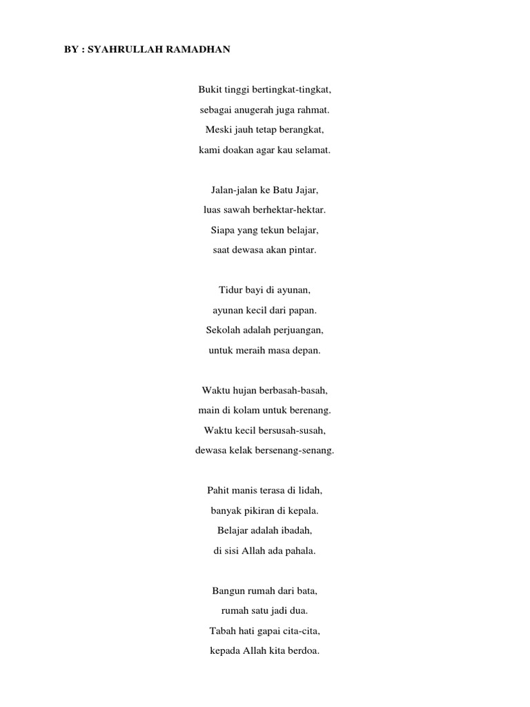 1 2 13 bayi tidur di ayunan ayunannya kecil dari papan sekolah itu tempat perjuangan tempat dirimu raih masa depan. Bayi tidur di atas ayunan ayunan terbuat dari papan sekolah tempat perjuangan tempatkan dirimu untuk masa depan. Oleh karena itu anda bisa mencoba mengungkapkan rasa perpisahan tersebut dengan pantun pantun perpisahan yang cenderung mengandung emosi yang lebih ringan dan menghibur. Pantun perpisahan adalah salah satu media untuk mencurahkan bagaimana beratnya perpisahan terlebih jika terpisah oleh kematian.