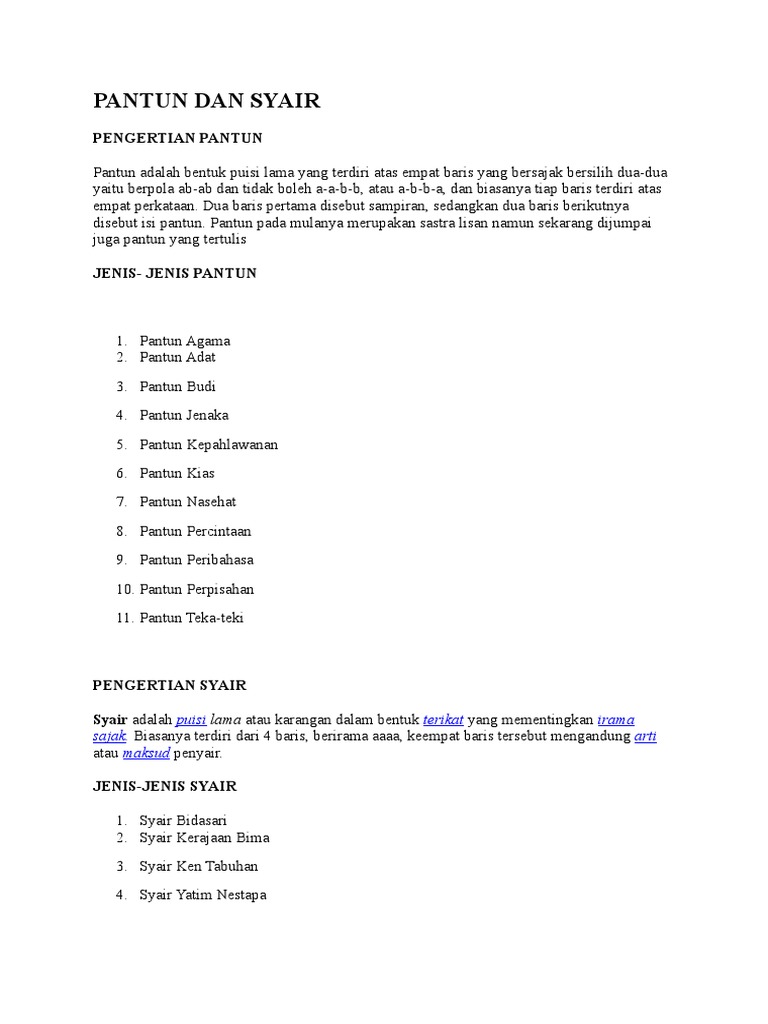 Pantun yang terdiri atas dua baris dan bersajak a a a a dinamakan. Setiap baris terdiri dari 8 12 suku kata. Disampaikan untuk menyindir secara langsung. Tiap baris terdiri atas 8 sampai 12 suku kata. Syair dan syair adalah puisi yang berlarik empat tiap bait dan bersajak a a a a yang mengisahkan suatu hal 5.