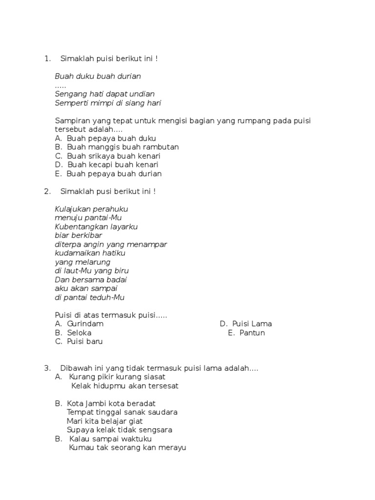 Lengkapilah pantun rumpang berikut ini. Pantun anak anak bersajak ab ab pantun jenaka bersajak ab ab pantun muda bersajak ab ab pantun agama bersajak ab ab dll hallo sahabat pembaca yang budiman semoga kita selalu dalam limpahan rahmat allah ta alaa ya. 1 jika ingin masuk surga 2 mari kita tebalkan iman 7. Kumpulan soal pilihan ganda bahasa indonesia kelas 9 1.
